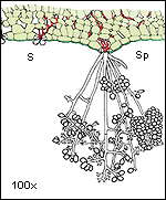 Den Falschen Mehltau findet man im Gegensatz zum Echten Mehltau auf der Blattunterseite. Die frei beweglichen Sporen (Zoosporen) dringen über Spaltöffnungen ins Wirtsgewebe ein, wo sie zwischen den Zellen (interzellulär) das Pilzgeflecht (Mycel) ausbilden. Über Saugfortsätze (Haustorien), welche in die lebenden Zellen eingebracht werden, entnehmen die Pilze der Pflanze Nährstoffe. Meist wächst das Mycel aus den Spaltöffnungen wieder aus und bildet hier verzweigte Fruchtkörper (Sporangienträger). Die große Anzahl der Fruchtkörper lässt einen gräulichen Schimmelrasen entstehen. Der Nährstoffverlust für die Pflanze lässt die befallenen Blätter vergilben und zum Abfall bringen. Bevorzugte Pflanzen: Calceolaria (Pantoffelblume), Primula (Primel), Senecio (Cinerarie), Sinningia (Gloxinie), Viola (Veilchen).